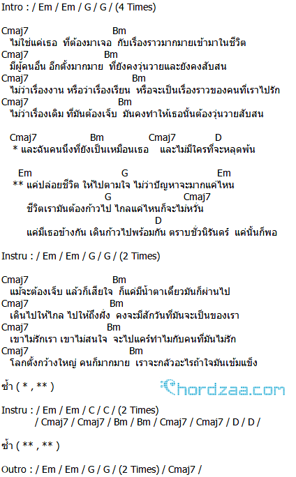 คอร์ด Em, คอร์ด G, คอร์ด Cmaj7, คอร์ด Bm, คอร์ด D, คอร์ด C