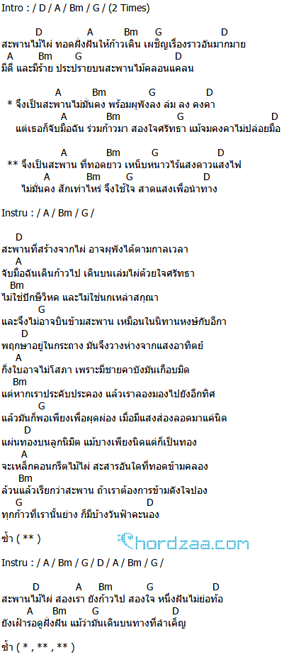 รูปแบบตารางคอร์ดกีตาร์ของคอร์ดเพลง สะพานไม้ไผ่
